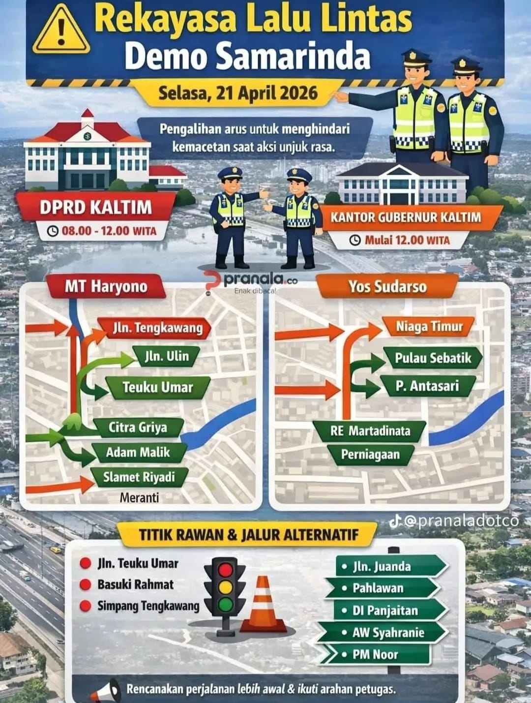 RingkasanMedia.id – Samarinda, Mengantisipasi rencana aksi penyampaian aspirasi masyarakat yang dijadwalkan berlangsung pada Selasa, 21 April 2026, Dinas Perhubungan (Dishub) Kota Samarinda bersama Satuan Lalu Lintas (Satlantas) Polresta Samarinda menyiapkan skema rekayasa lalu lintas di sejumlah titik strategis.