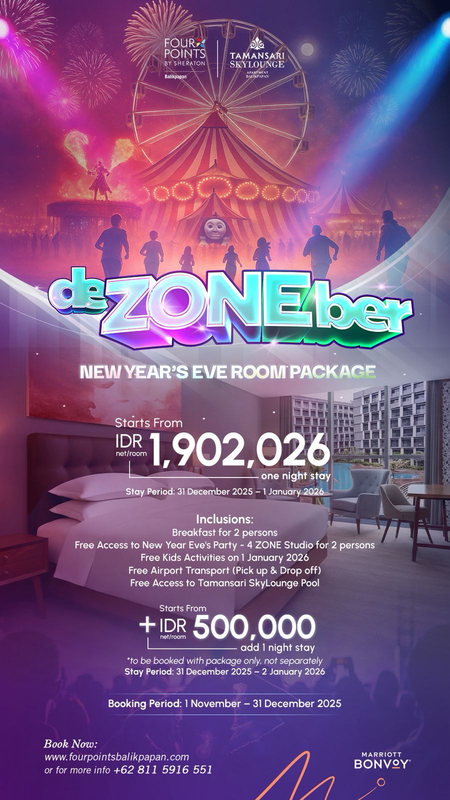 Untuk menyambut pergantian tahun, Four Points by Sheraton Balikpapan menawarkan paket “deZONEber”, paket menginap termasuk pesta Tahun Baru dengan harga Rp1.902.026 net per malam. Paket ini sudah mencakup sarapan dan makan malam pergantian tahun untuk dua orang. Tamu juga dapat memperpanjang masa menginap menjadi dua malam, dari 31 Desember 2025 hingga 2 Januari 2026, hanya dengan tambahan Rp500.000.