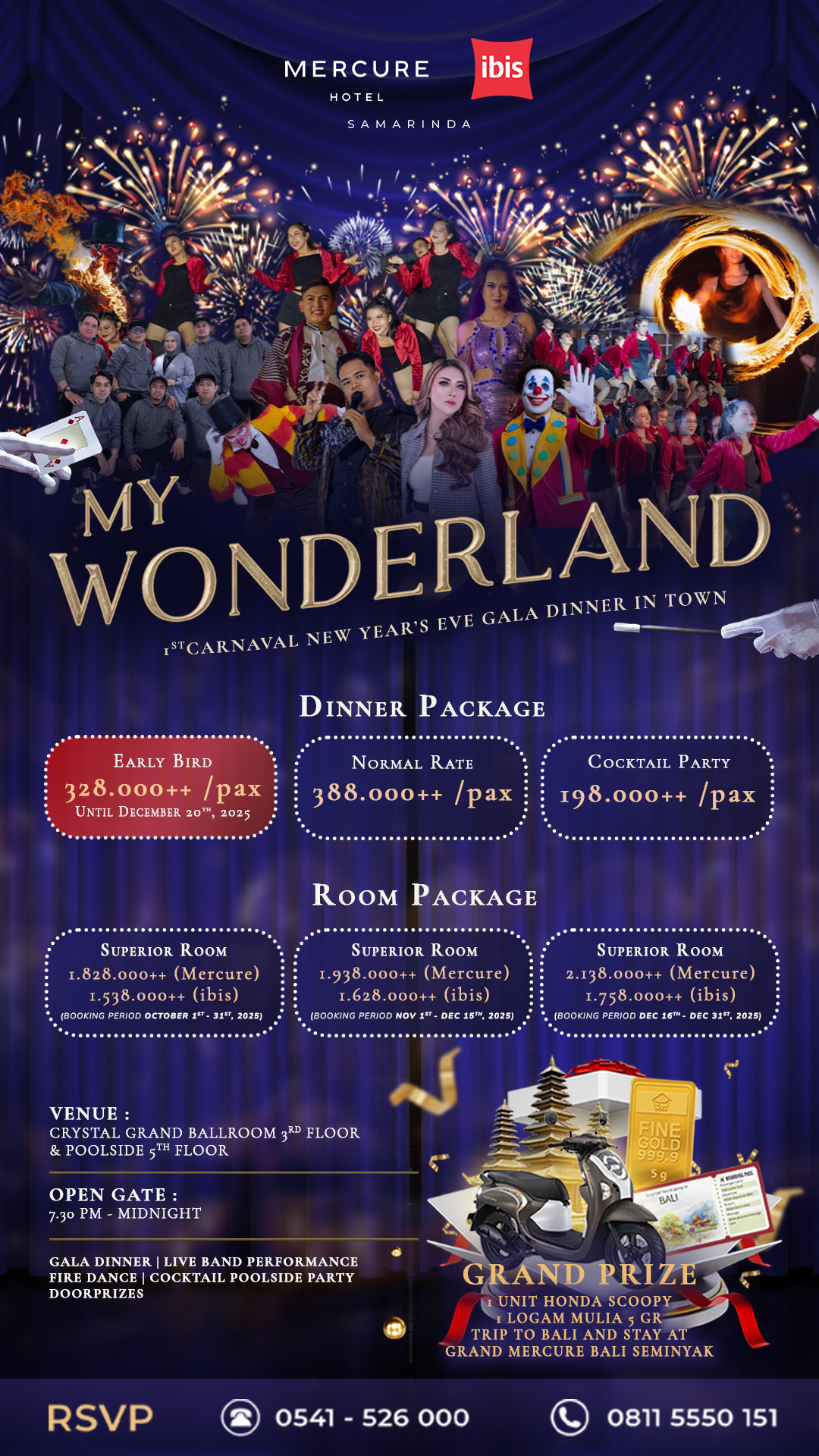 Seto menjelaskan, perayaan malam pergantian tahun akan digelar di Crystal Ballroom dan puncak countdown menuju 2026 akan dipusatkan di area pool outdoor dengan tema My Wonderland yang dikemas lebih meriah. Beragam doorprize disiapkan, termasuk hadiah utama motor, logam mulia 5 gram, serta paket perjalanan ke Bali lengkap dengan tiket pesawat.