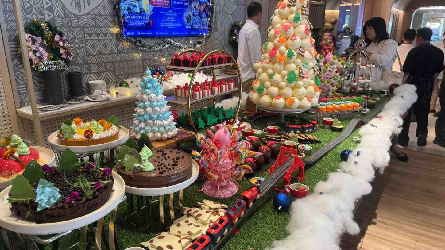 Nuansa Natal semakin terasa melalui dekorasi mewah di seluruh lobby, mulai dari Pohon Natal megah, rumah biskuit jahe, hingga kehadiran sosok Sinterklas yang menyapa tamu.