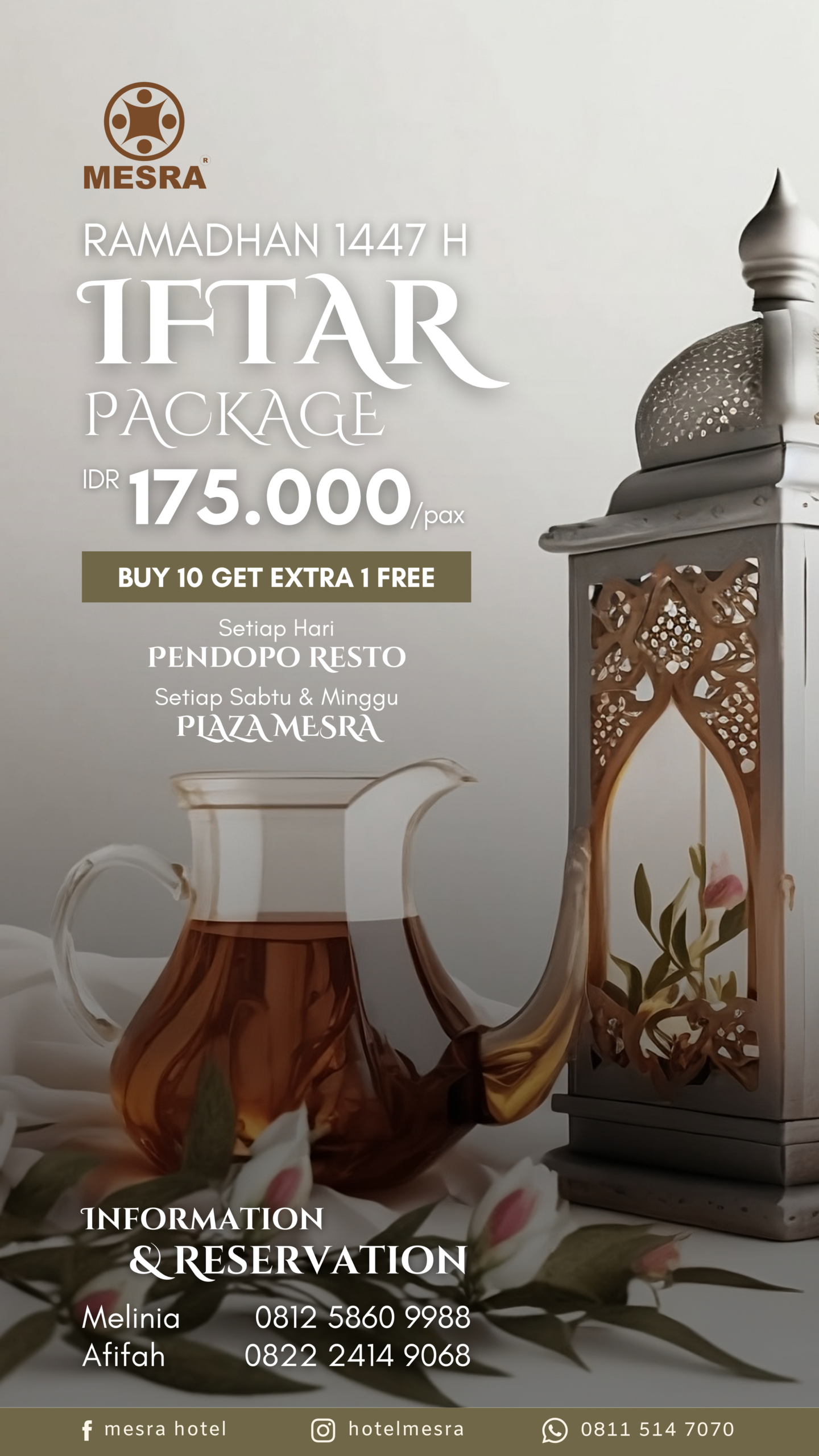 Program Iftar di Pendopo Resto digelar setiap hari, sementara setiap Sabtu dan Minggu suasana semakin meriah dengan Iftar di Plaza Mesra yang menghadirkan Gambus Performance. Hotel juga bekerja sama dengan Brothers Photobooth untuk menyediakan spot foto menarik bagi para tamu yang ingin mengabadikan momen Ramadan.